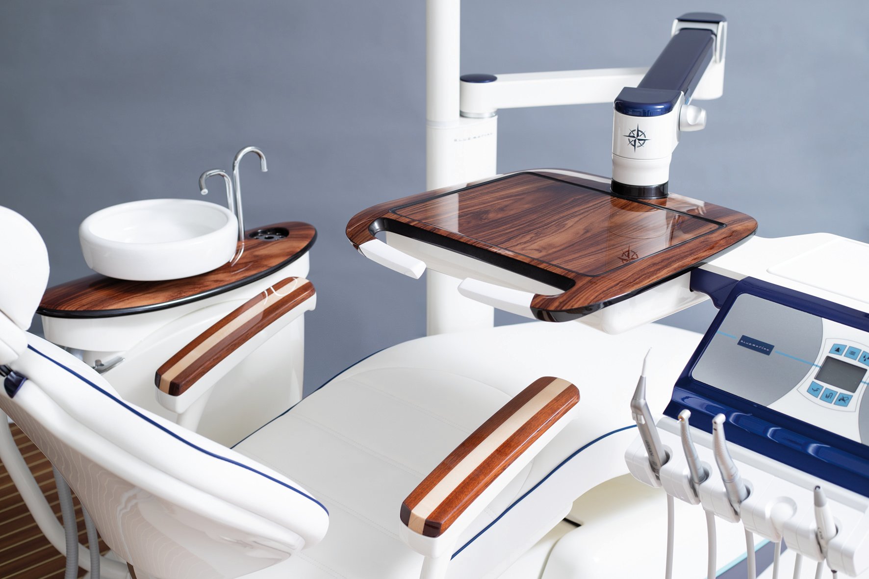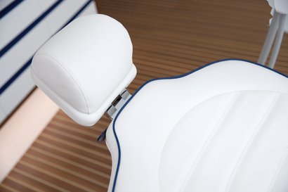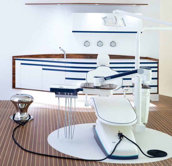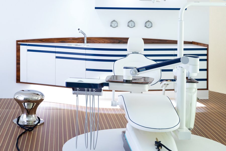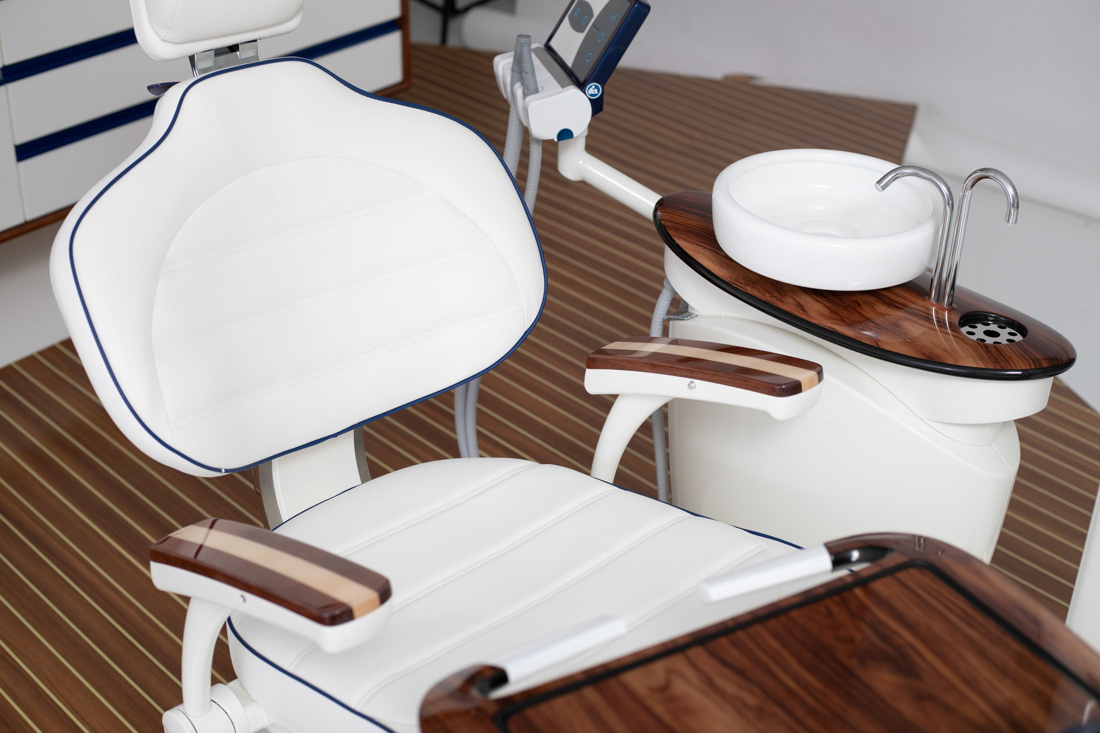 De behandeleenheid heeft een speciale afwerking in de maritieme kleuren zuiver wit, parelblauw en turquoise. Chromen elementen op het spittoon en drinkglasvuller en chromen handgrepen aan de operatielamp onderstrepen het uiterlijk van het jacht.
