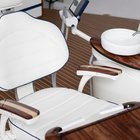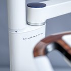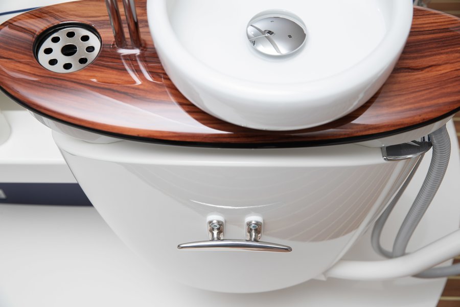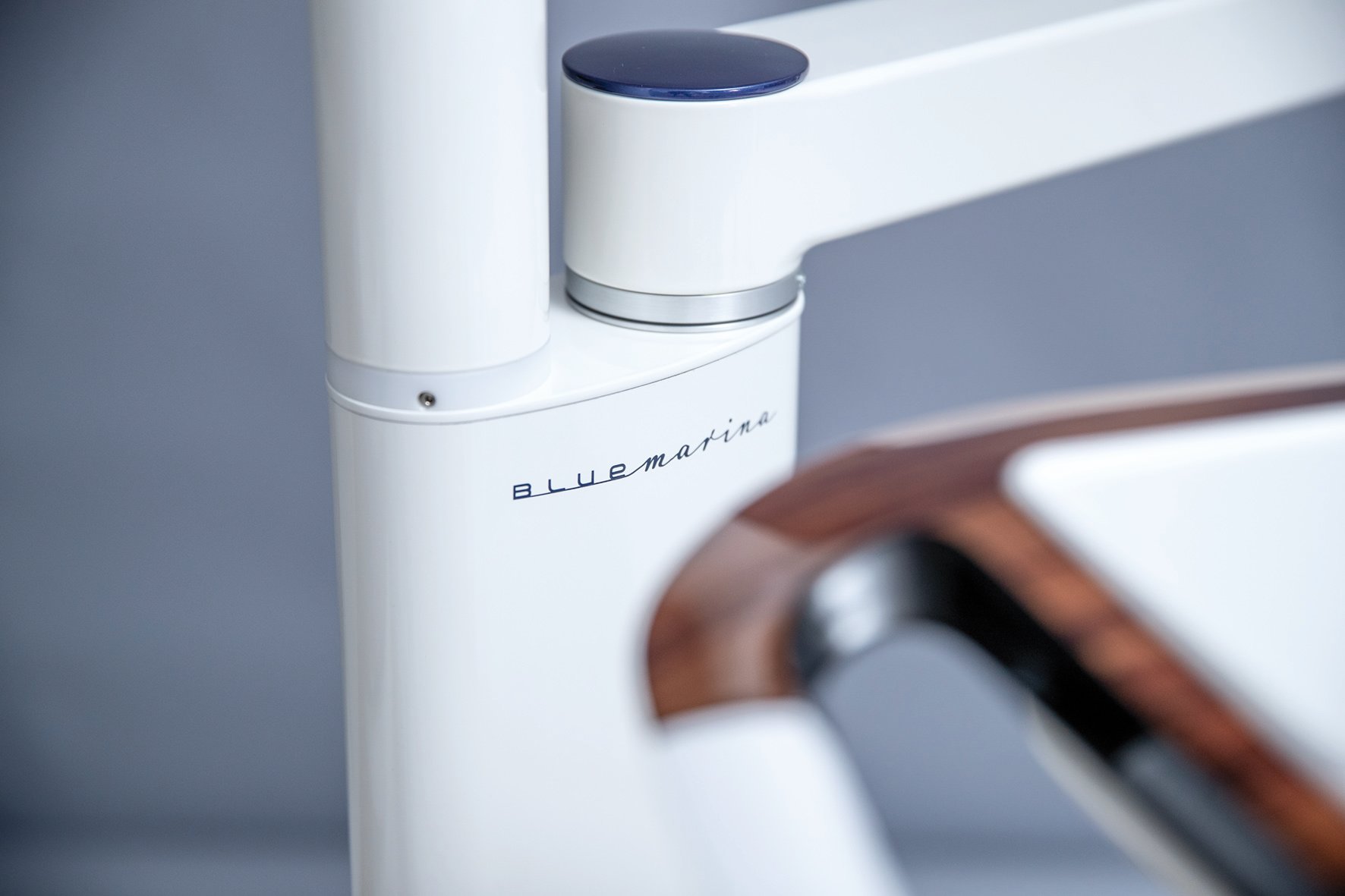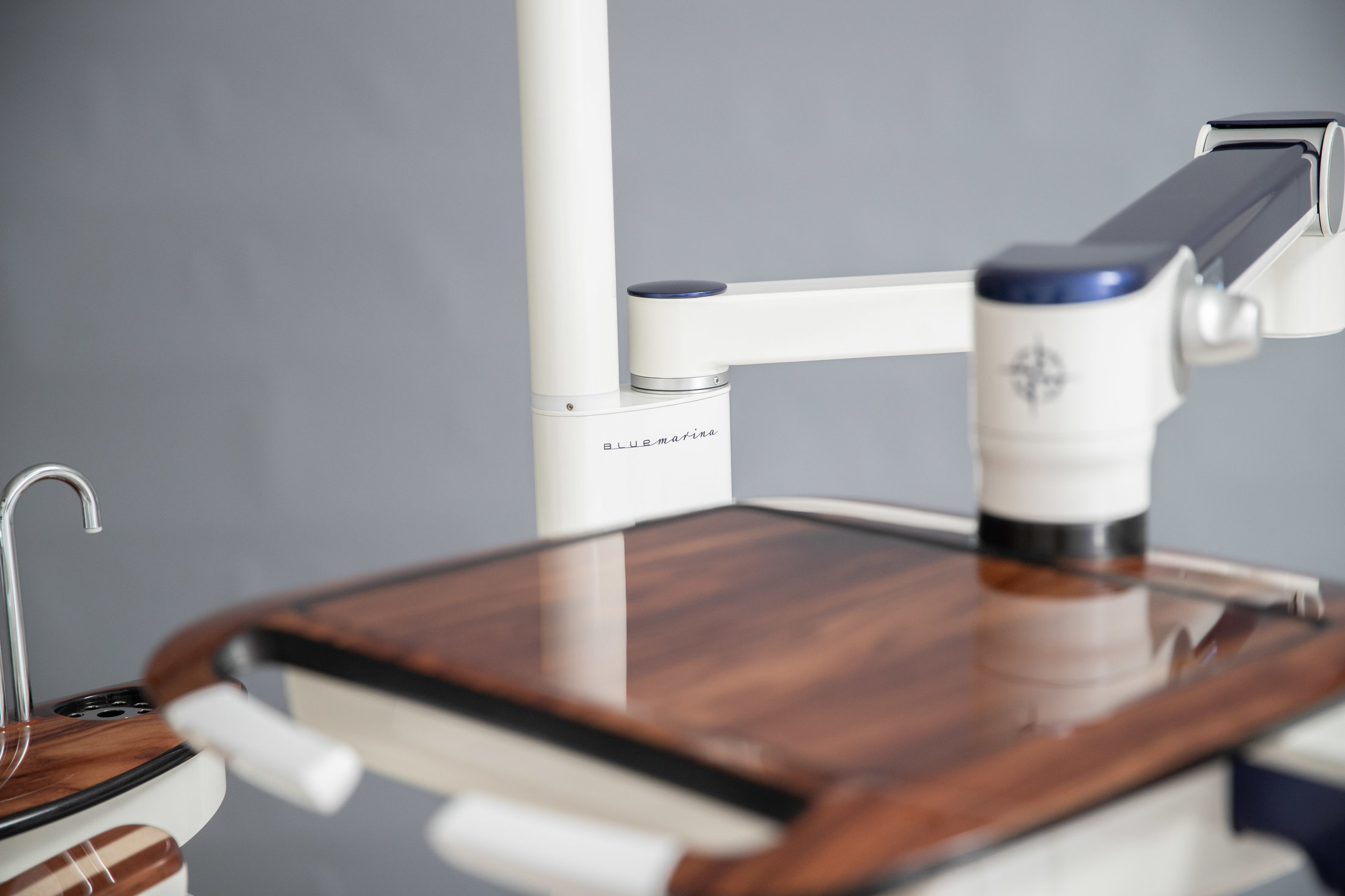 De behandeleenheid heeft een speciale afwerking in de maritieme kleuren zuiver wit, parelblauw en turquoise. Chromen elementen op het spittoon en drinkglasvuller en chromen handgrepen aan de operatielamp onderstrepen het uiterlijk van het jacht.