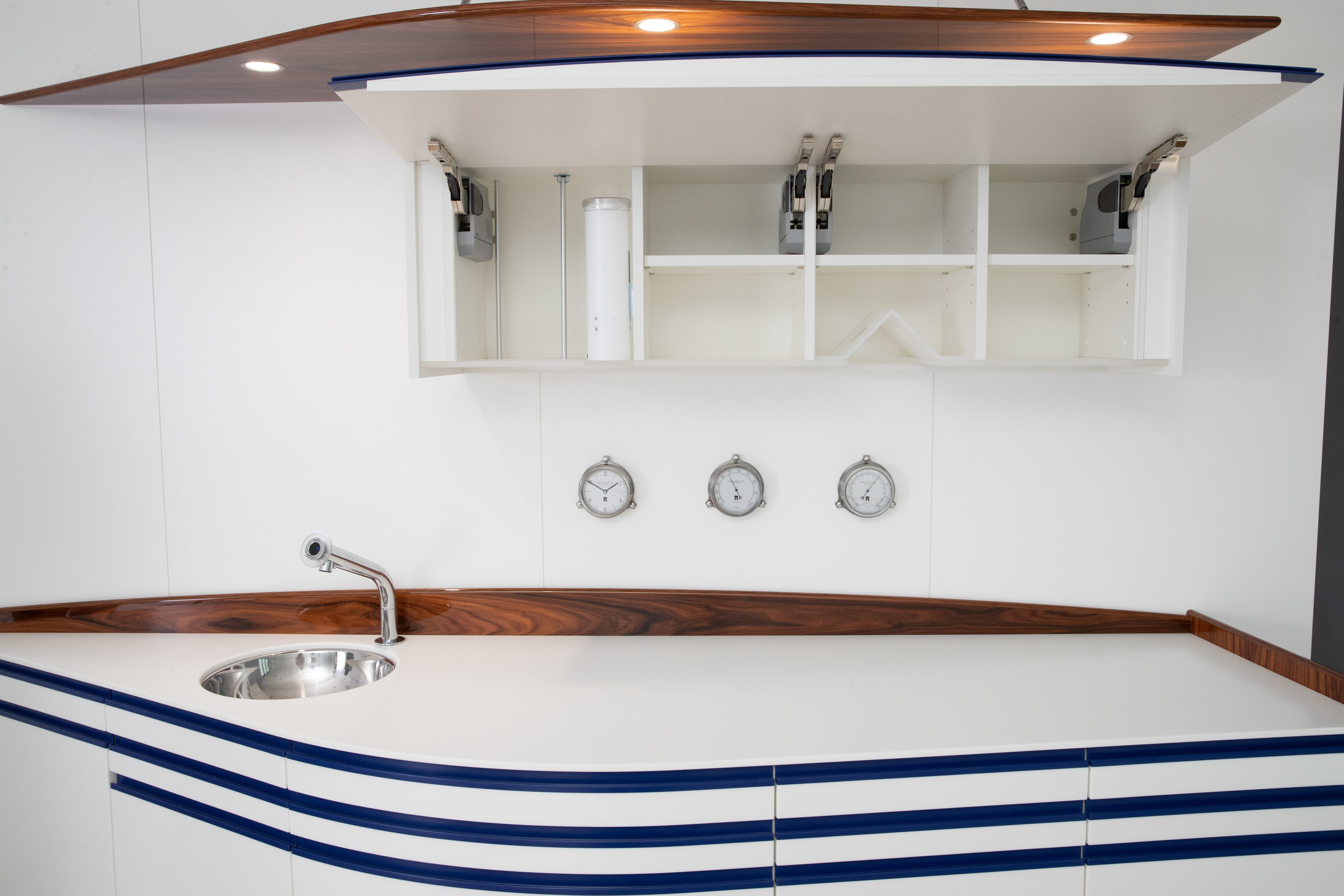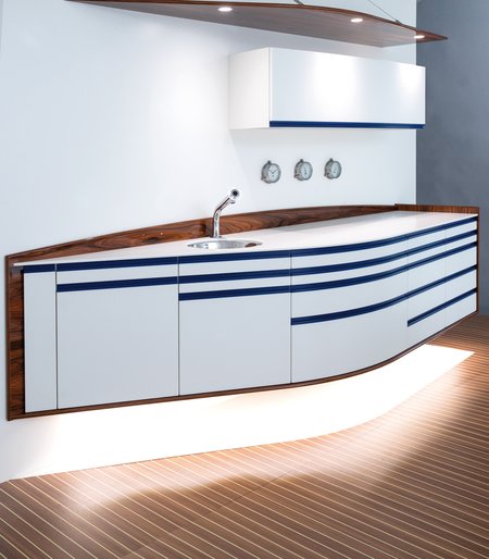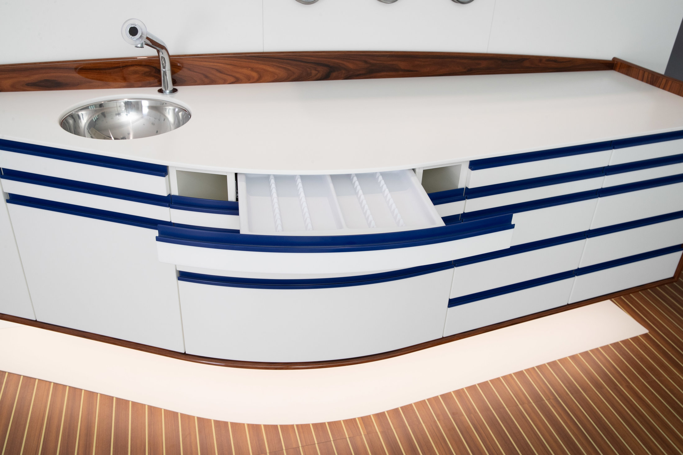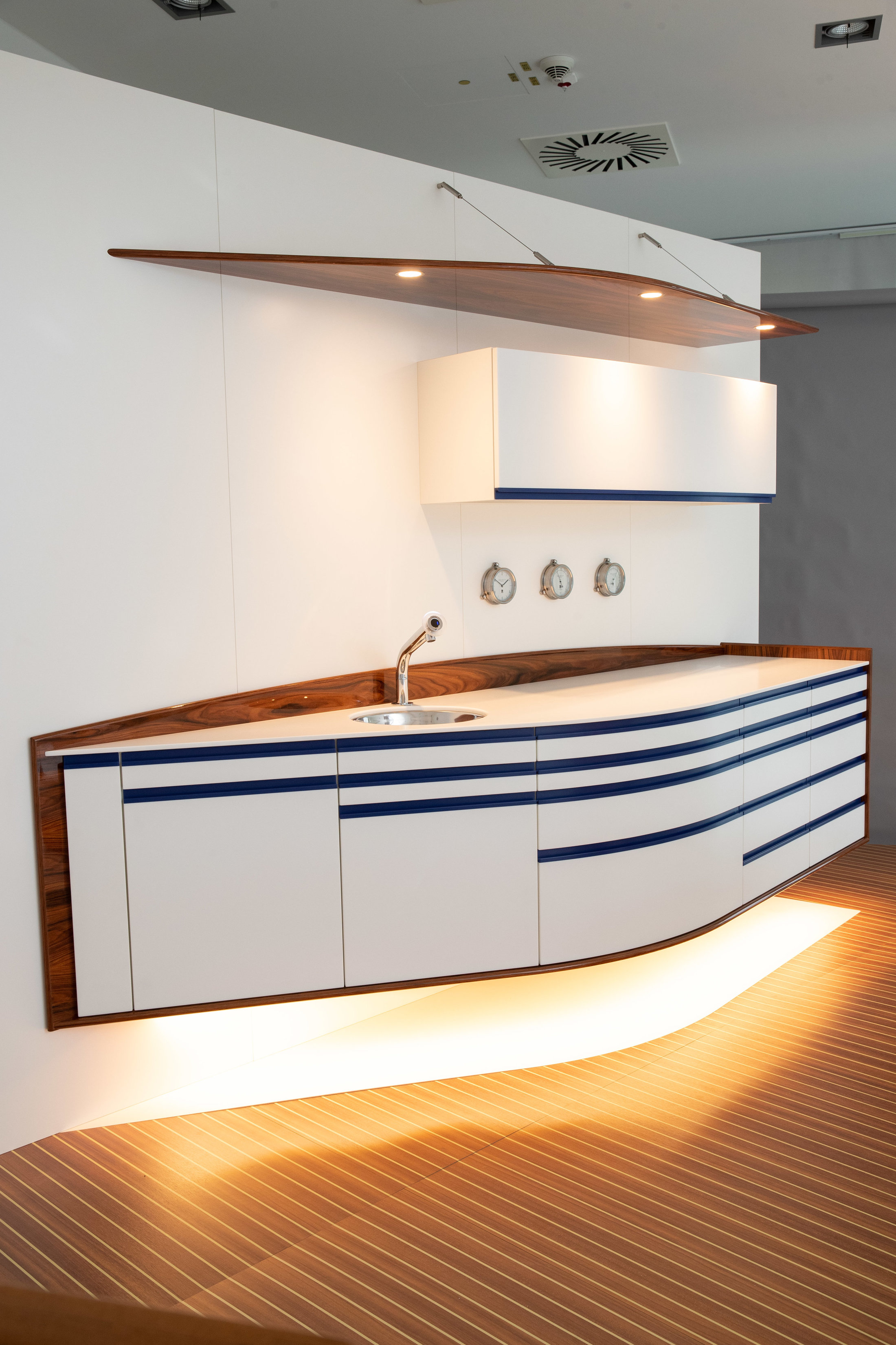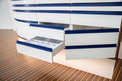 De vorm van de behandelingslijn is gebaseerd op de dynamische en gestroomlijnde romp van een jacht. Niet alleen emotioneel, maar ook functioneel voldoet het maritieme meubelsysteem aan alle eisen: