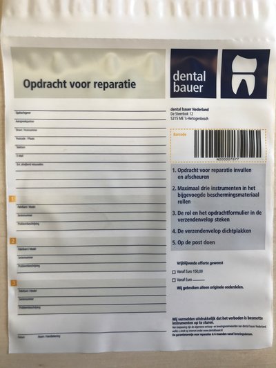 dental bauer Nederland biedt u de verzendenvelop voor het onderhoud en reparatie van uw micromotoren en hand- en hoekstukken. De envelop is voorzien van een voorgedrukt reparatieformulier dat u makkelijk kunt invullen. Het versturen gaat door het formaat eenvoudig met de dagelijkse praktijkpost. Vanzelfsprekend zonder portokosten door gebruik van ons antwoordnummer.