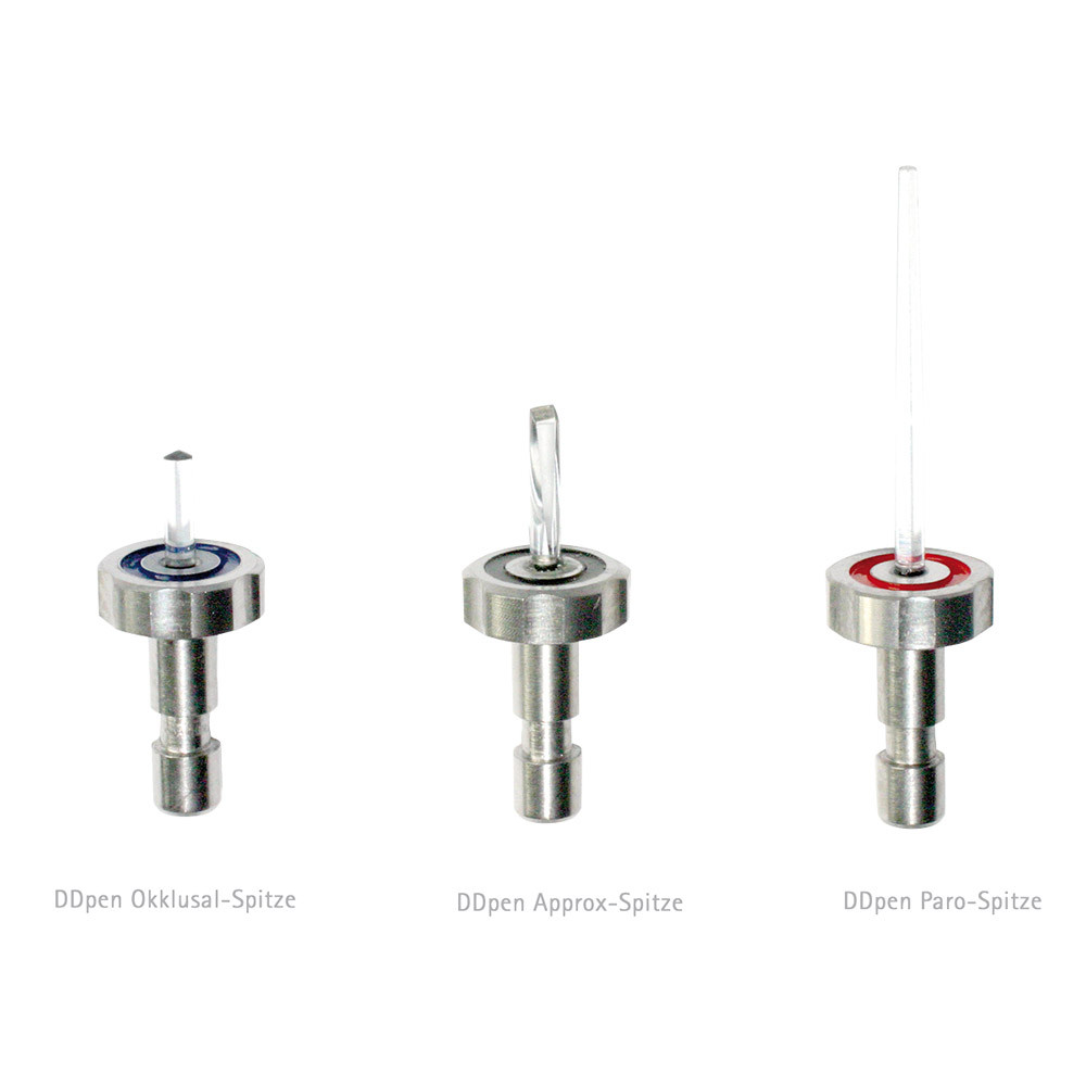 Voor het detecteren van approximale cariës, fissuurcariës, cariës op gladde oppervlakken en calculus in parodontale pockets. Klein, compact en draadloos handstuk met zowel een akoestisch als digitaal display. Met de saffiersondes kan cariës nu ook in de approximale ruimte worden gedetecteerd door de tand te scannen door de laserstraal bij 100° C rond het contactoppervlak te laten afbuigen. De beschikbare onderzoeksresultaten laten een hoge specificiteit en gevoeligheid zien. Naast cariësdetectie wordt de DIAGNOdent pen gebruikt met een speciale probe voor het detecteren van tandsteen in paro pockets. Met de probe kan de diepte van de pocket worden gemeten en kan de reinheid van de pocket in één handeling worden gecontroleerd.