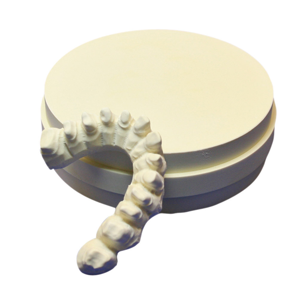 Ein fräsbarer Gipsblank mit außerordentlicher Kantenstabilität, hergestellt aus einem kunststoffvergüteten Superhartgips zum Herausfräsen von Gipsmodellen. Die mechanischen Eigenschaften des Fräsgipses sind auf die Anforderungen einer Fräsbearbeitung abgestimmt und gewährleisten selbst bei hohen Vorschüben und großen Materialzustellungen glatte und splitterfreie Fräsoberflächen. Aufgrund der besonderen Rezeptur entsteht beim Fräsprozess keine Staubentwicklung, das Material wird spanförmig abgetragen.