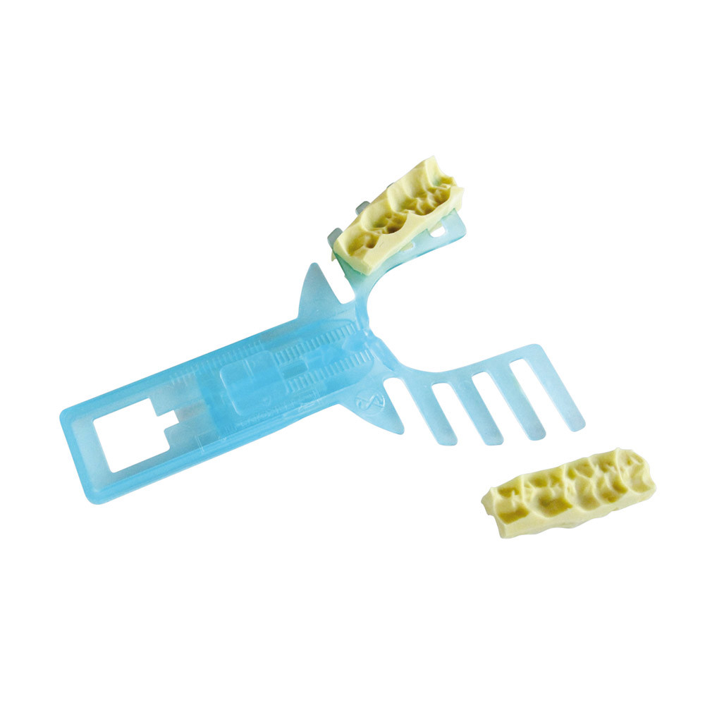 Lehre für Konstruktionsbissnahmen mit veränderter anteriorer Bisslage. Die sl-Protrusionslehre ermöglicht auf einfache Weise die gewünschte bzw. empfohlene Vorlage des Silensor-sl zu registrieren.