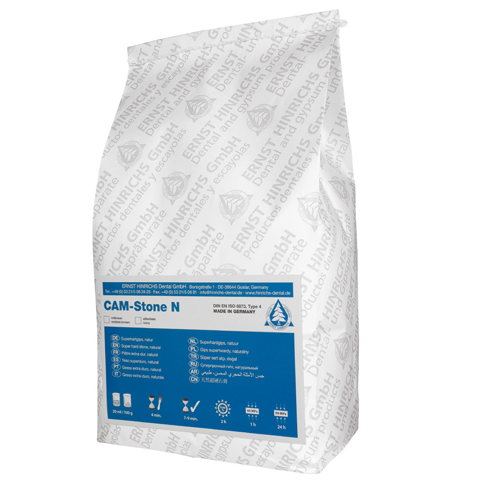 Speciaal gips voor CAD/CAM-systemen. CAM-Stone N is perfect voor de digitalisering en verdere bewerking en maakt het poederen van de gipsmodellen overbodig voor de opto-elektronische palpatie alvorens te scannen. Dit gips voorkomt de storende reflectie in de bepaalde golfbereiken. Door de korte afbindtijd vereist dit slechts één behandeling in de behandelstoel.