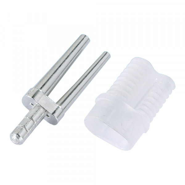 Smalle modelstomp met twee geleidepennen, bijzonder geschikt voor smalle positioneringen waar de ruimte beperkt is. V-vormig profiel maakt gebruik bij zeer smalle stompjes mogelijk, bijvoorbeeld in het mandibulaire anterieure gebied. Per stomp is slechts één boorgat nodig. Gemakkelijk glijden in de uiteindelijke positie dankzij de conische pinvorm. De open hulsbasis voorkomt verstopping en maakt eenvoudig reinigen mogelijk. Reproduceerbare positionering zonder beetverhoging. Kleine basisvorm door gereduceerde pinlengte. Pinlengte: 12,5 mm, koplengte: 5,5 mm, totale lengte: 18 mm, ø kop: 2,0 mm