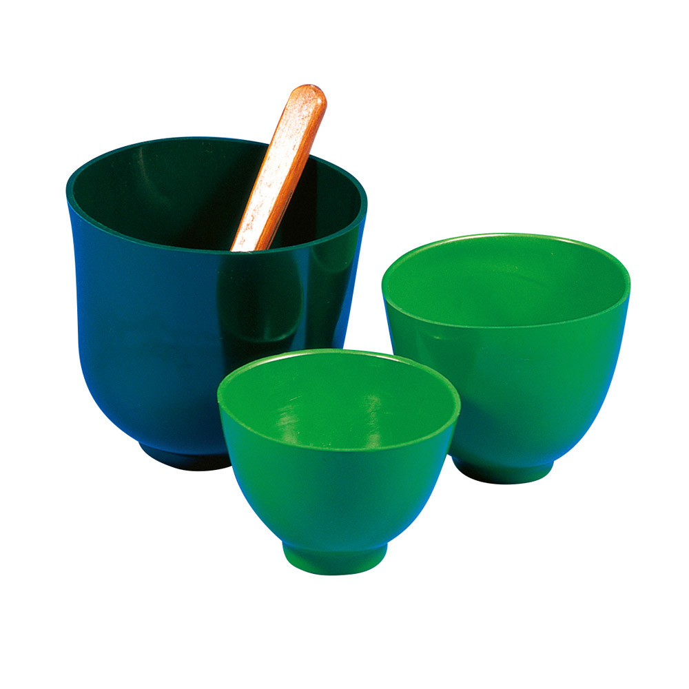 Groen, flexibel mengbakje. Eenvoudig te reinigen, voor alginaat, gips, enz. Zeer hoogwaardig, flexibel materiaal. In drie maten/hoogtes leverbaar.Gips- en alginaatmengspatel van kunststof. Optimaal afgehoekt, ergonomisch handvat.