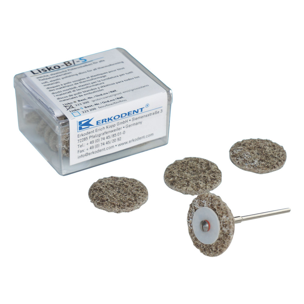 De korrelgrootte komt overeen met Lisko bruin. Lisko-B heeft door de gebonden structuur een langere levenscyclus. Ook dikke, harde splints (bijv. Erkodur en Erkolo-pro 3,0 - 5,0 mm) kunnen hiermee worden geslepen, voorgepolijst, en zonder kantige of vlakke slijpsporen worden uitgewerkt. Vervolgens het werk voortzetten door het fijnpolijsten met Lisko-S.