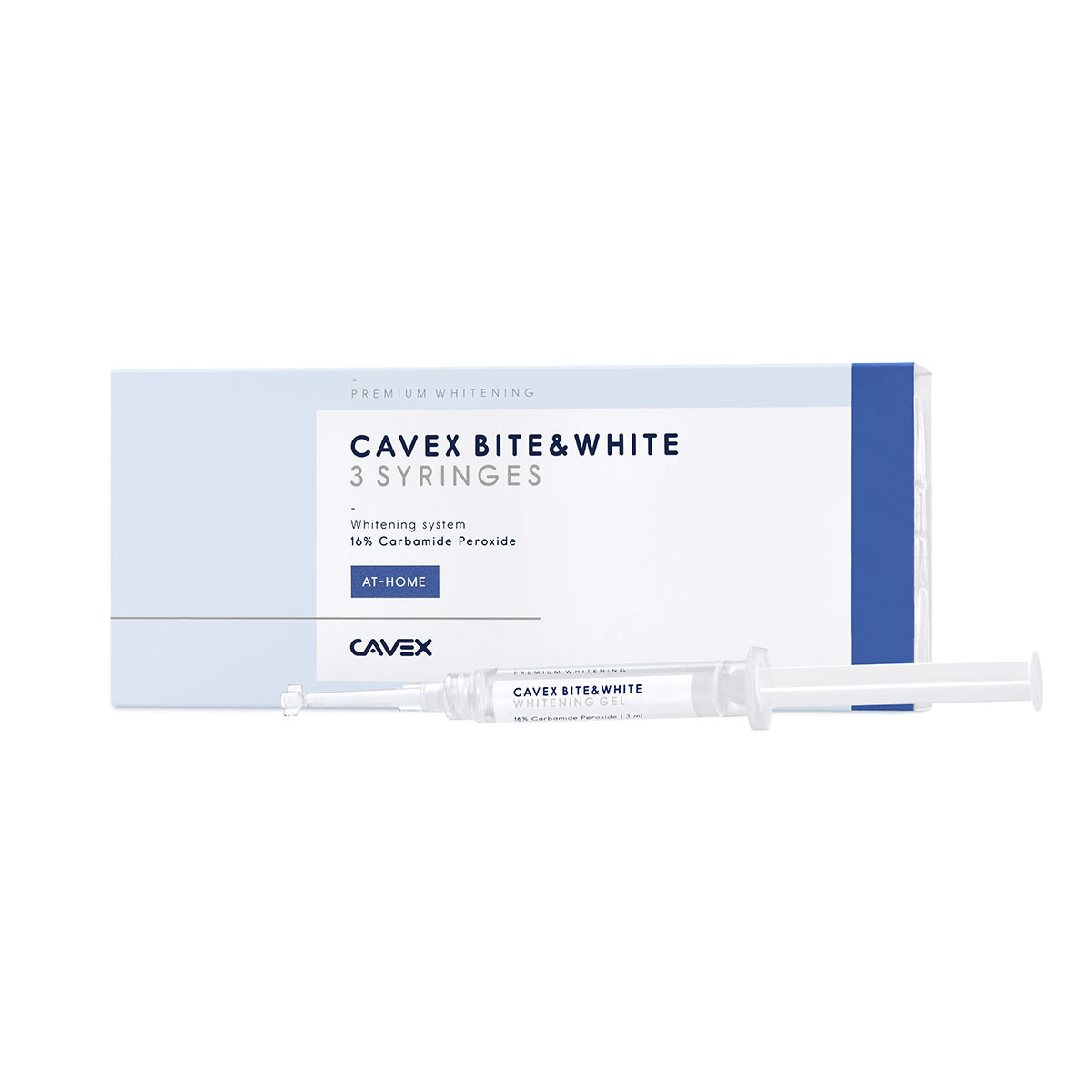 De Cavex Bite&White whitening gel bevat 16% carbamideperoxide, wat overeenkomt met 6%...