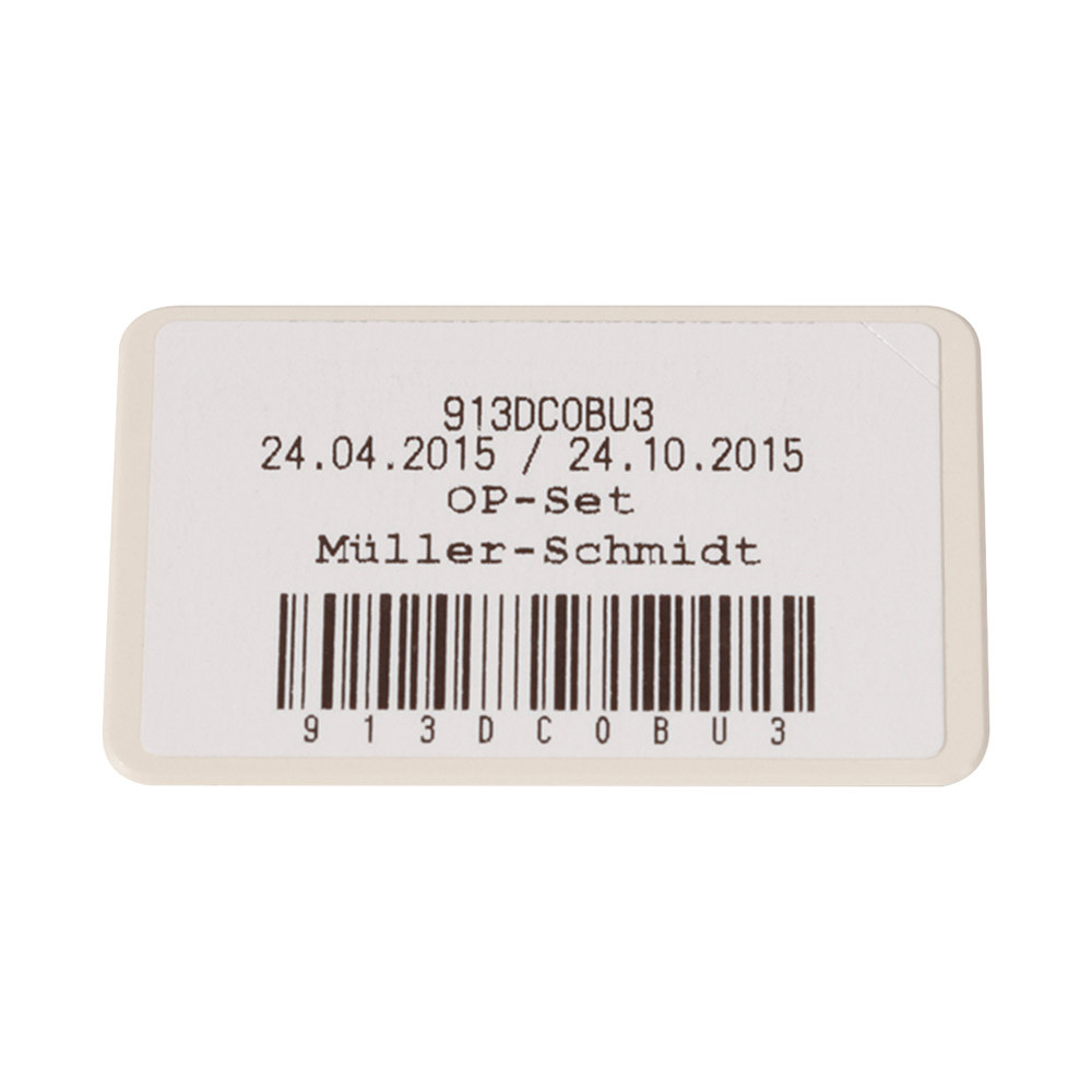 Das Barcode-Schild ist zum Aufkleben von Etiketten eines Labeldruckers vorgesehen, z. B. den Etiketten des MELAprint 60. Das Barcode-Schild wird in den Halter der MELAstore-Box eingesetzt. Für die MELAstore-Box 100 und MELAstore-Box 200.