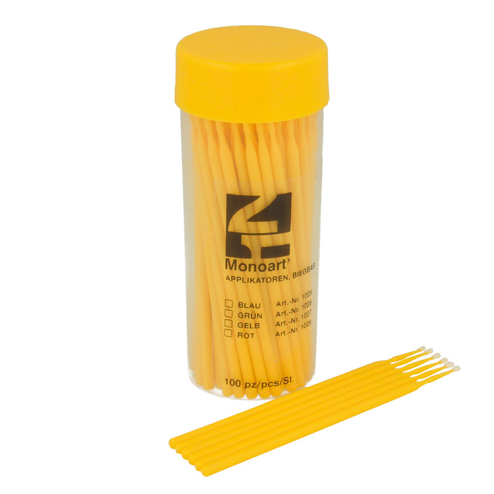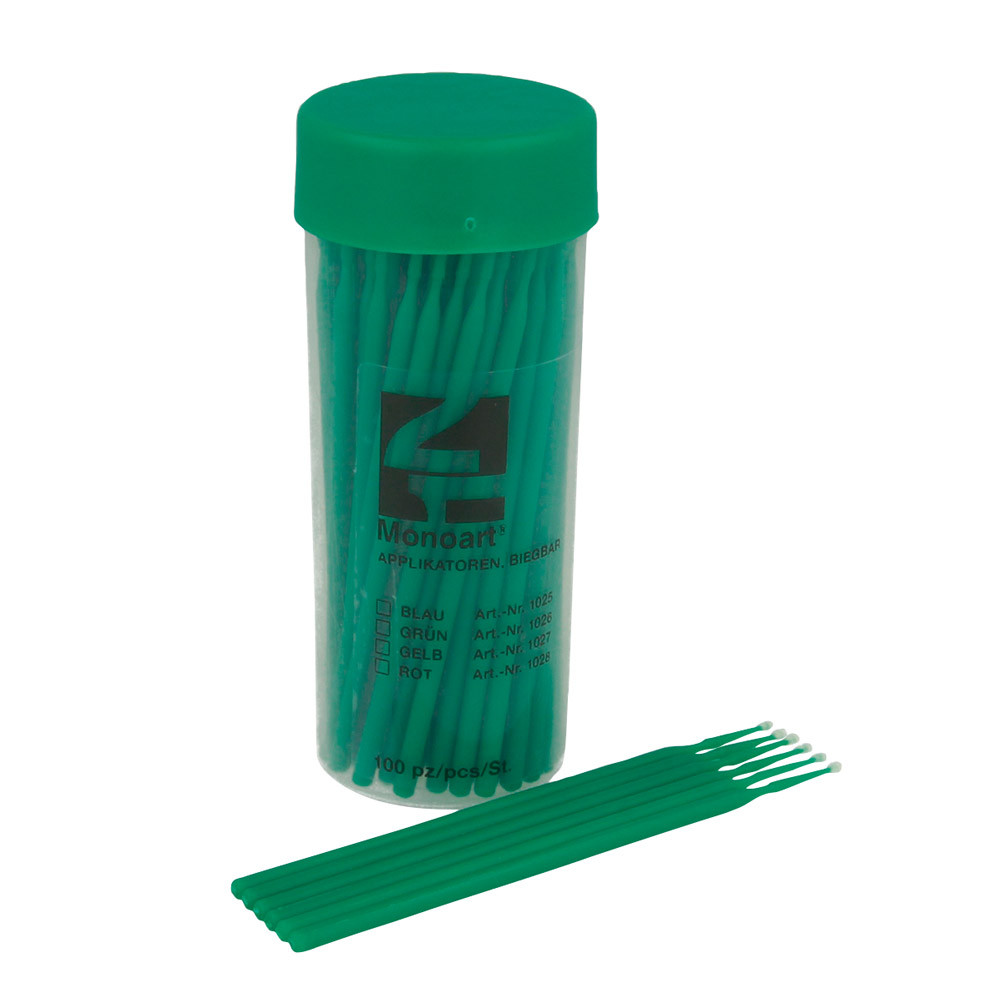 Zur punktgenauen Applikation von Pasten, Gels und Flüssigkeiten. Beflockte, biegbare Spitze.