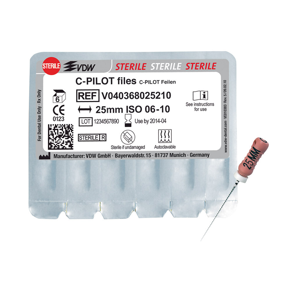 Bijzonder stevige, dunne vijlen voor het sonderen van moeilijke, verkalkte wortelkanalen, ook ideaal voor het creëren van een glijpad voor machinaal prepareren met NiTi-vijlen. Dankzij een speciaal thermisch proces zijn de C-Pilot vijlen steviger en buigen ze minder door. Steriel in de blistercel voor onmiddellijk gebruik.