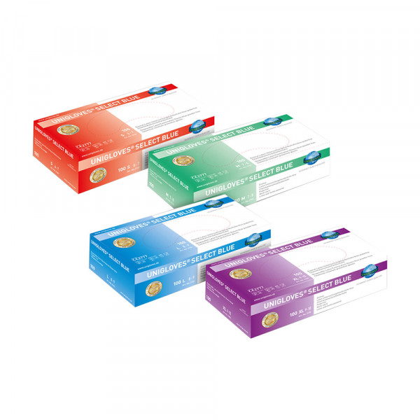 Niet steriele, poedervrije Select Blue latex handschoenen met rolrand. Micro-geruwde handvlakken. Kleurgeleidingssysteem. Vervaardigd volgens EN 455, T. 1-4, EN 374. AQL 1,5. Bescherming tegen chemicaliën EN 374. Toegelaten voor levensmiddelen.