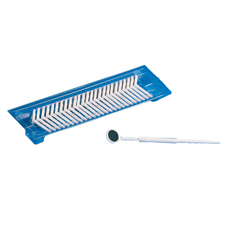 Disposable plastic mondspiegeltje. Beslaat niet dankzij "Anti-Fog" laag. Handgreep met vervangbare spiegel – alleen de spiegel is disposable.