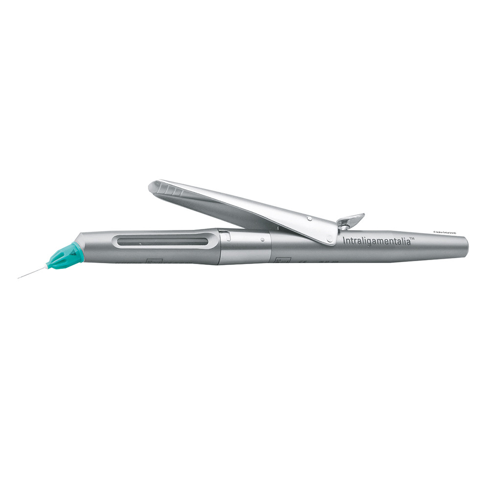 Intraligamentalia, cilinderampullenspuit voor de intraligamentaire en intraseptale plaatselijke verdoving. Individuele tandverdoving gedurende ca. 30 minuten, comfortabele en precieze dosering (0,06 ml/klick), drukbegrenzing, meerdere kwadranten gedurende één behandeling mogelijk. Materiaal: Edelstaal, 1 jaar garantie.