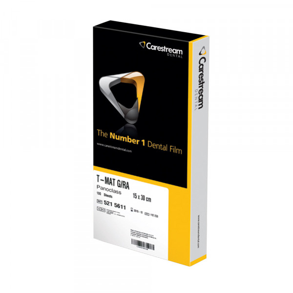 Orthochromatische röntgenfilm voor gebruik met groen-uitstralende versterkingsfolie. Door een perforatie in het midden van de film kan de film worden opgevouwen voor eenvoudige archivering in het patiëntendossier.