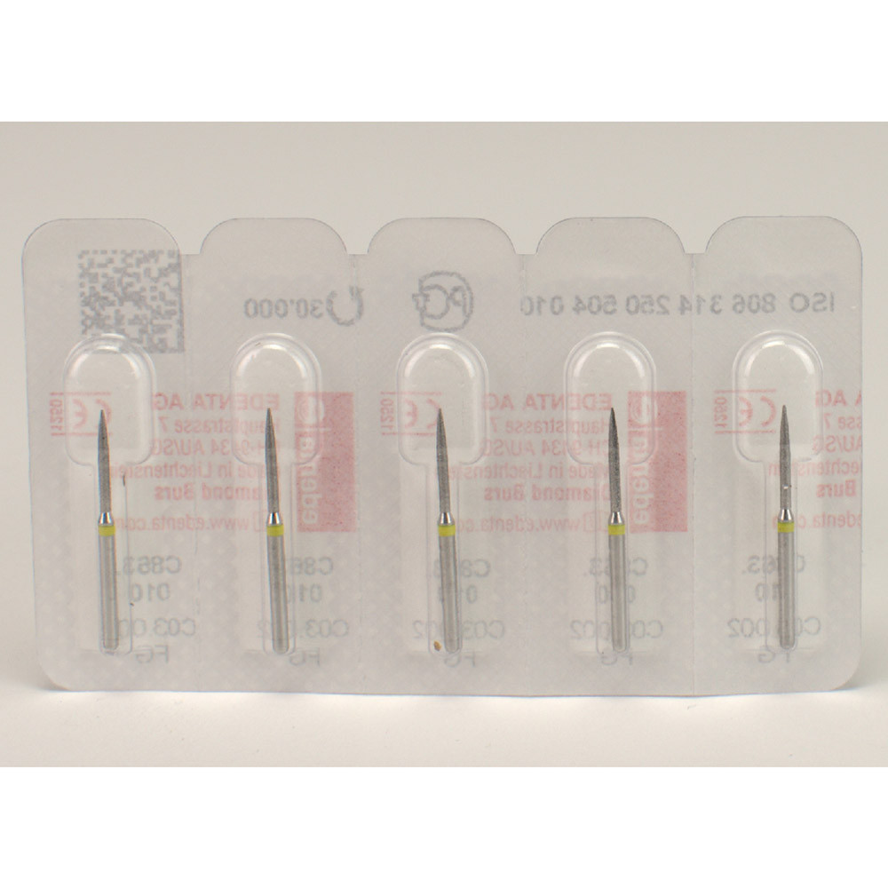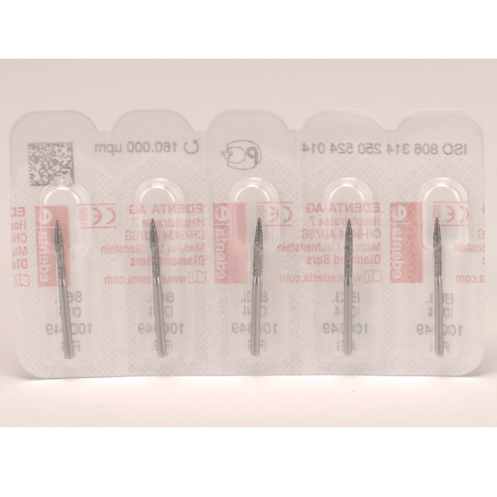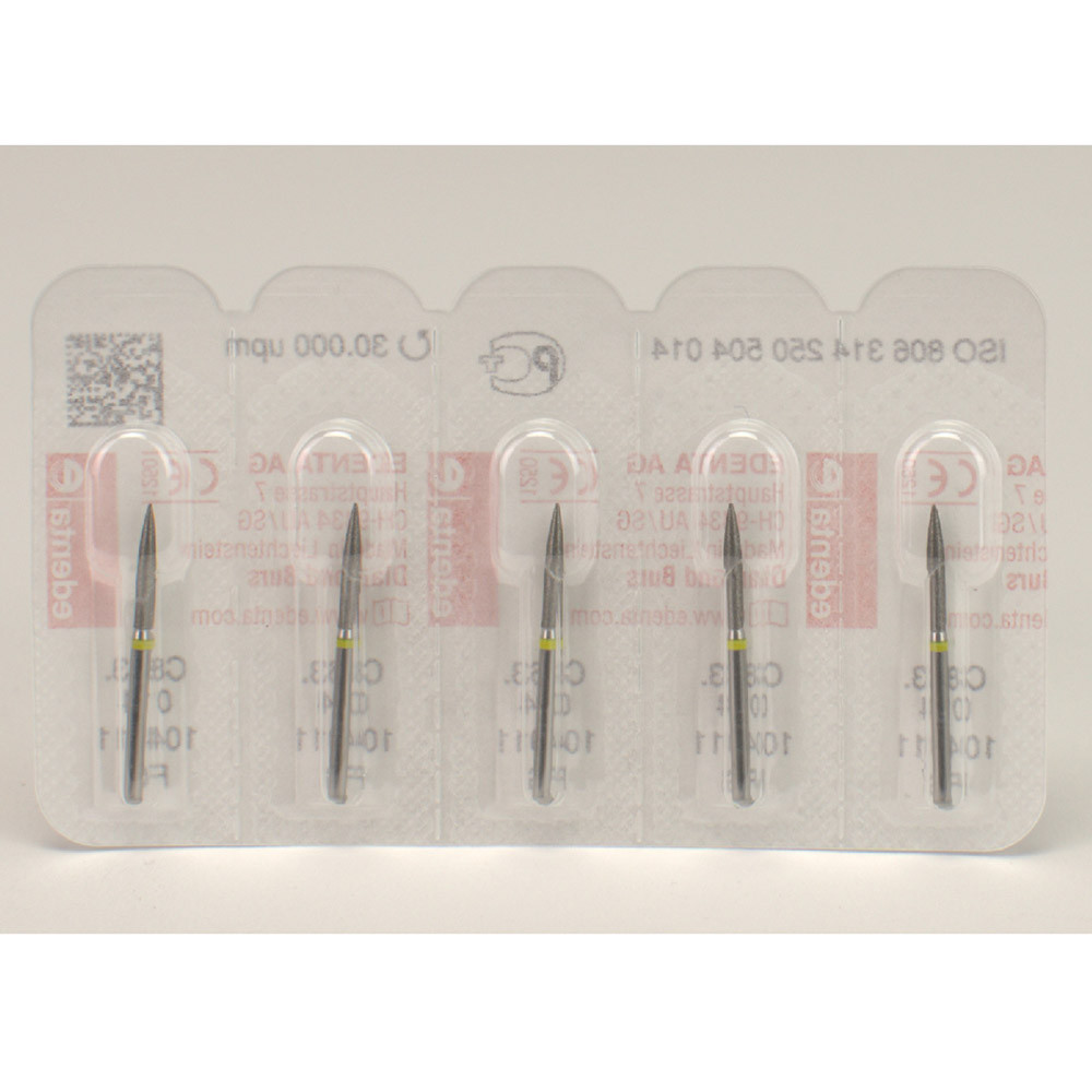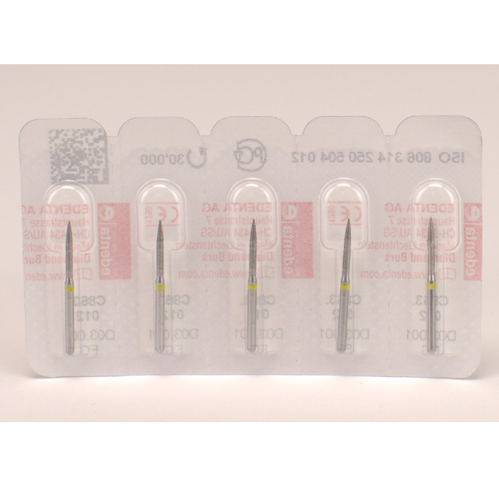 Mit feiner Diamantkörnung zum Abrunden von Approximalflächen, zum Separieren von Keramik.