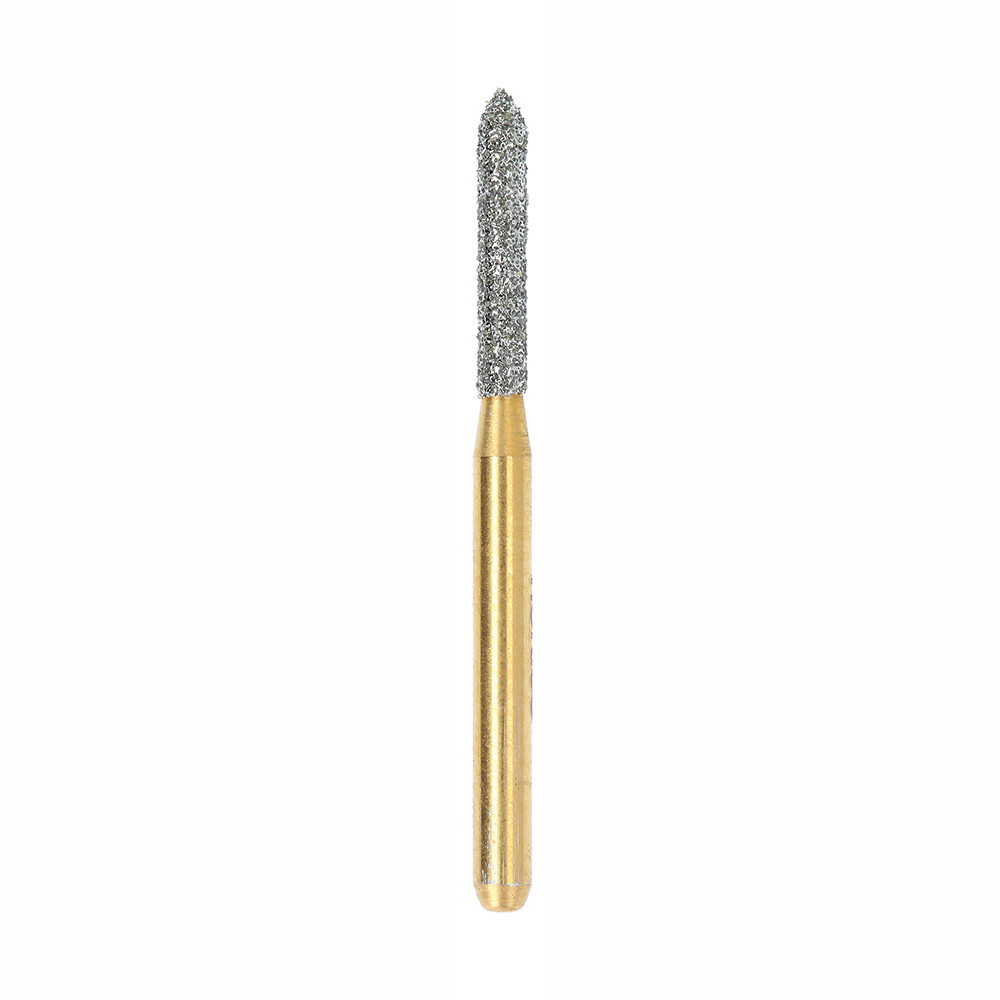 Leeuwenboren verguld, hygienisch en slijpen sneller. FG-diamant-slijpsteen normale korrelgrootte (ca. 100-120µm). zwart = supergrof. groen = grof. blauw = normaal. rood = fijn. geel = extra fijn. wit = ultra fijn.