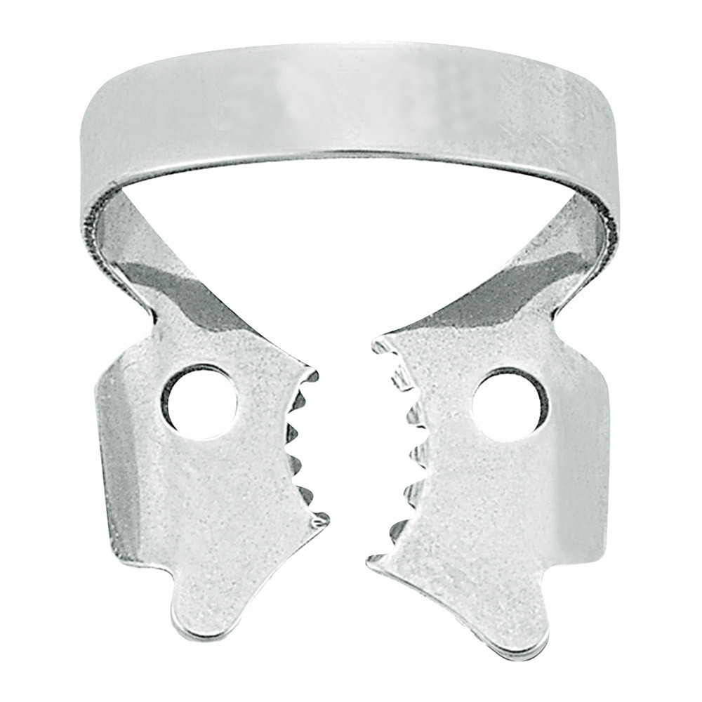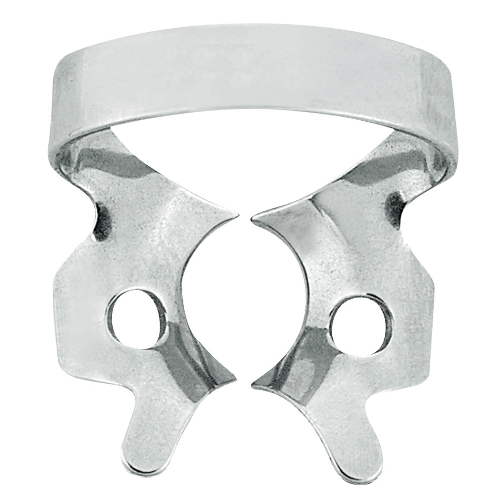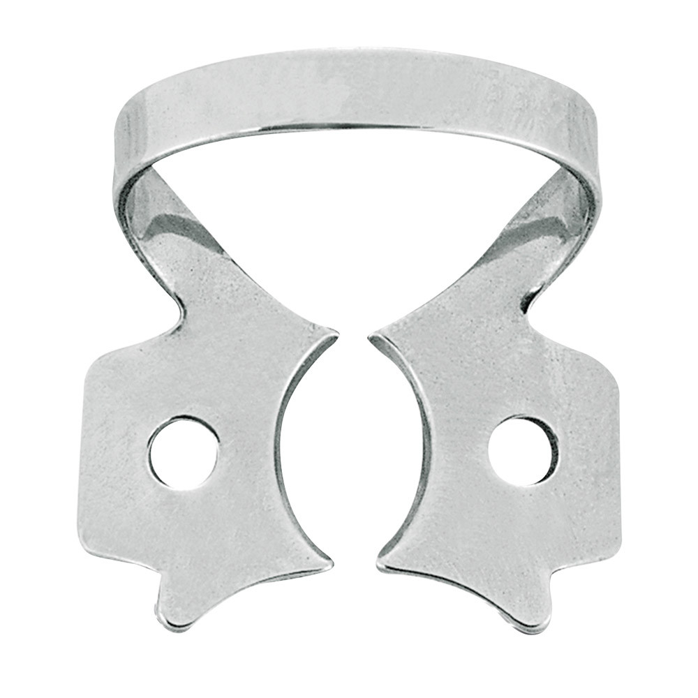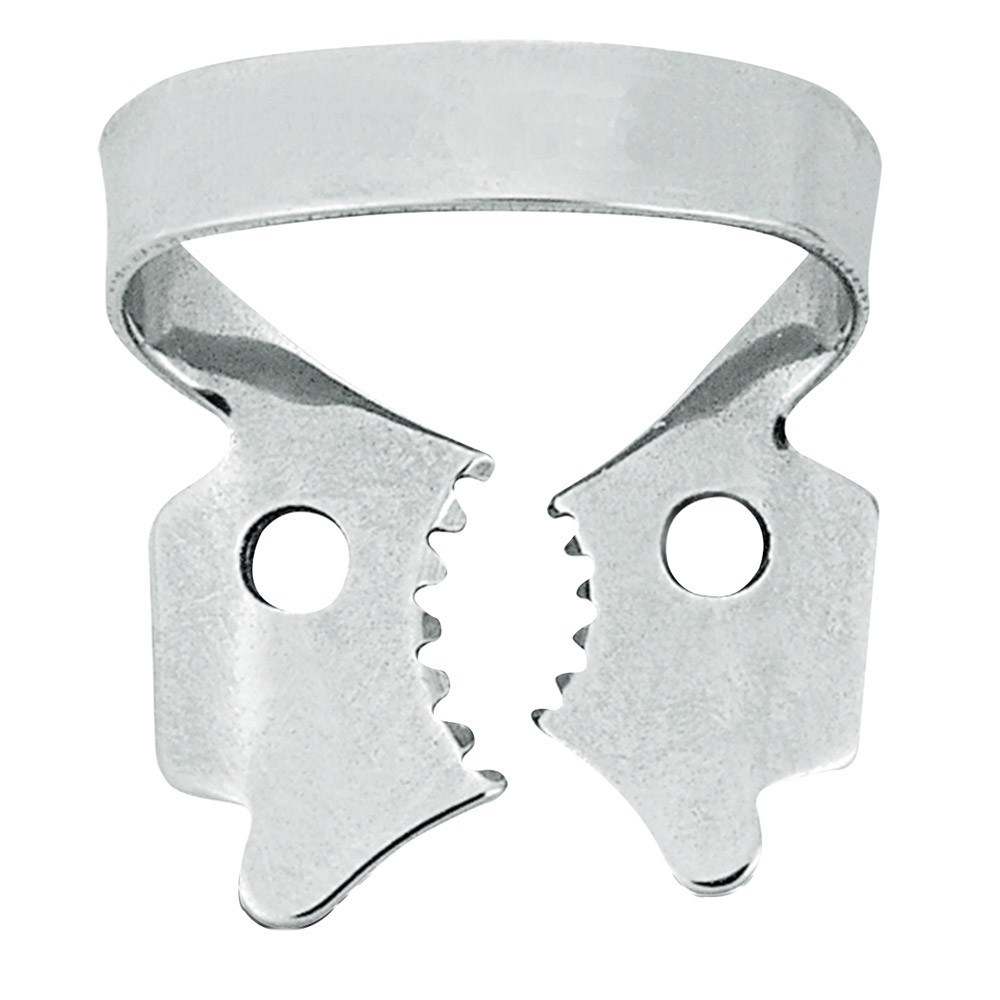 Hoogwaardige roestvrijstalen klemmen met betrouwbare constante spanning voor het bevestigen van de rubberdam op het te behandelen gebitselement.