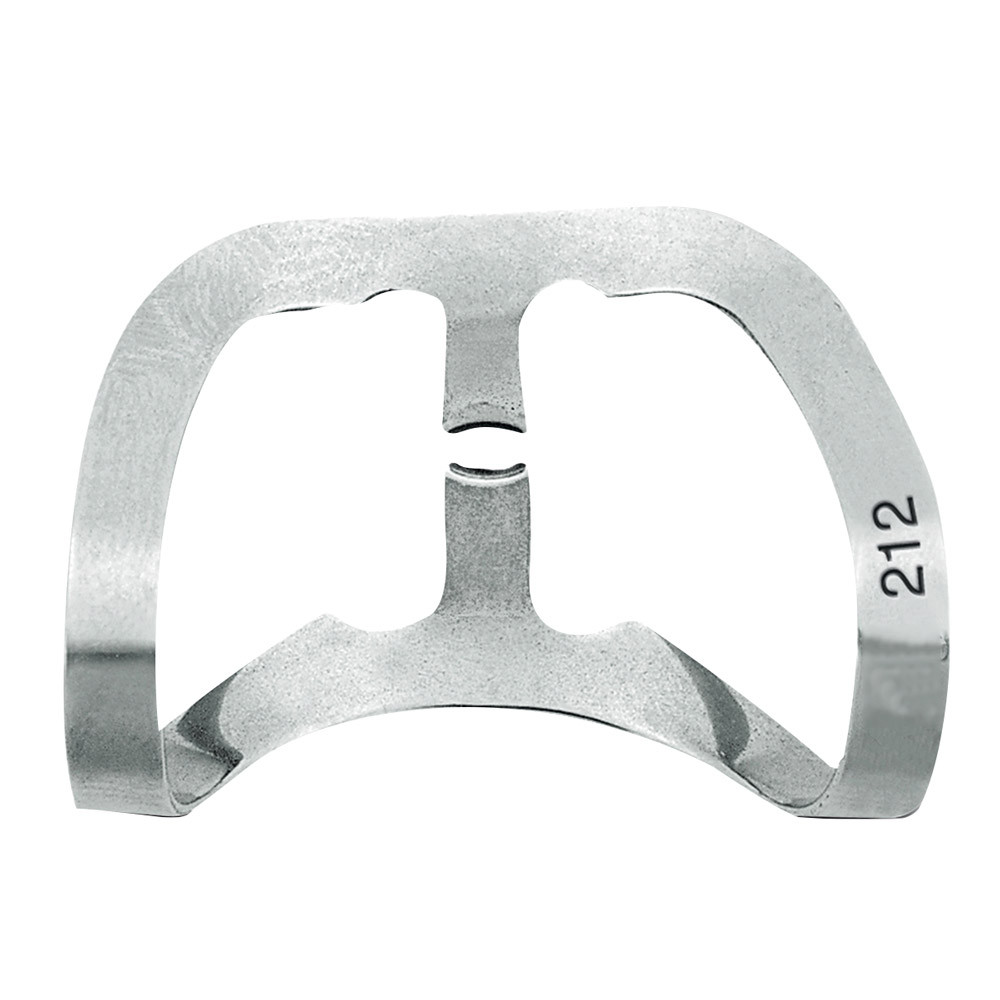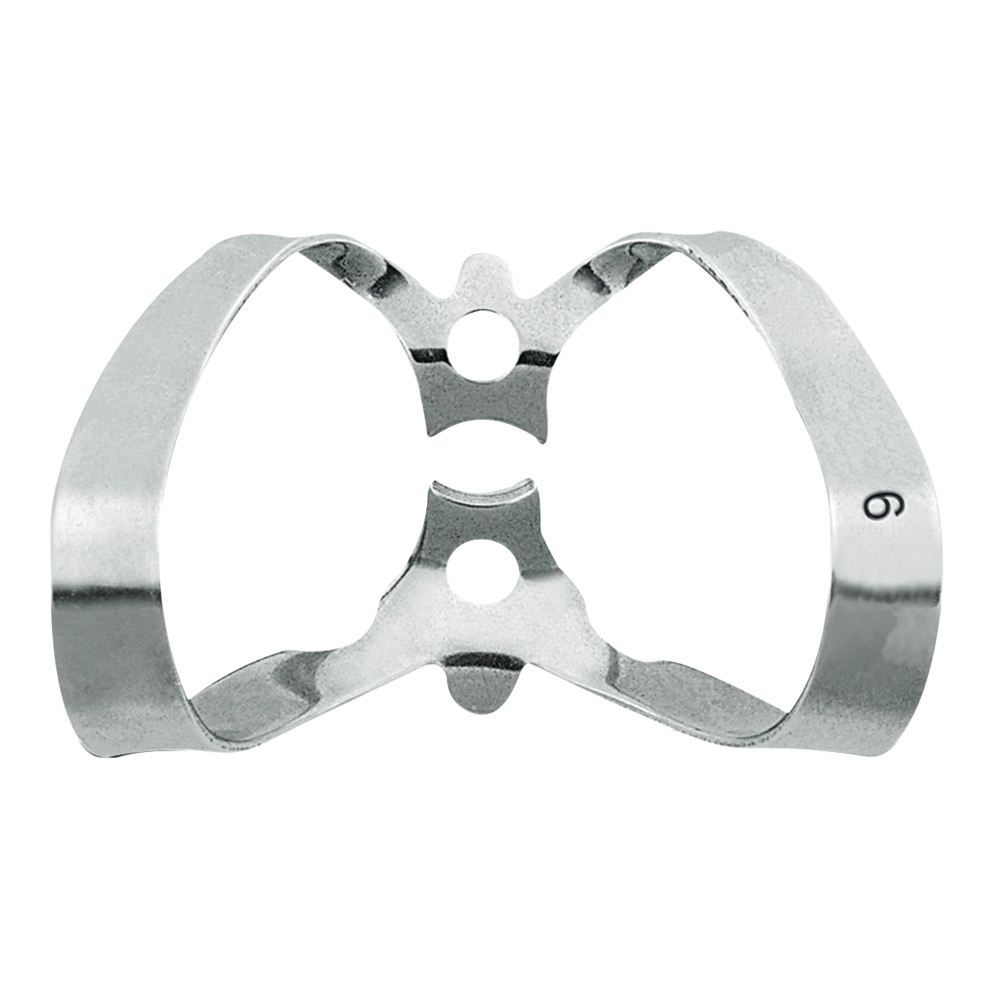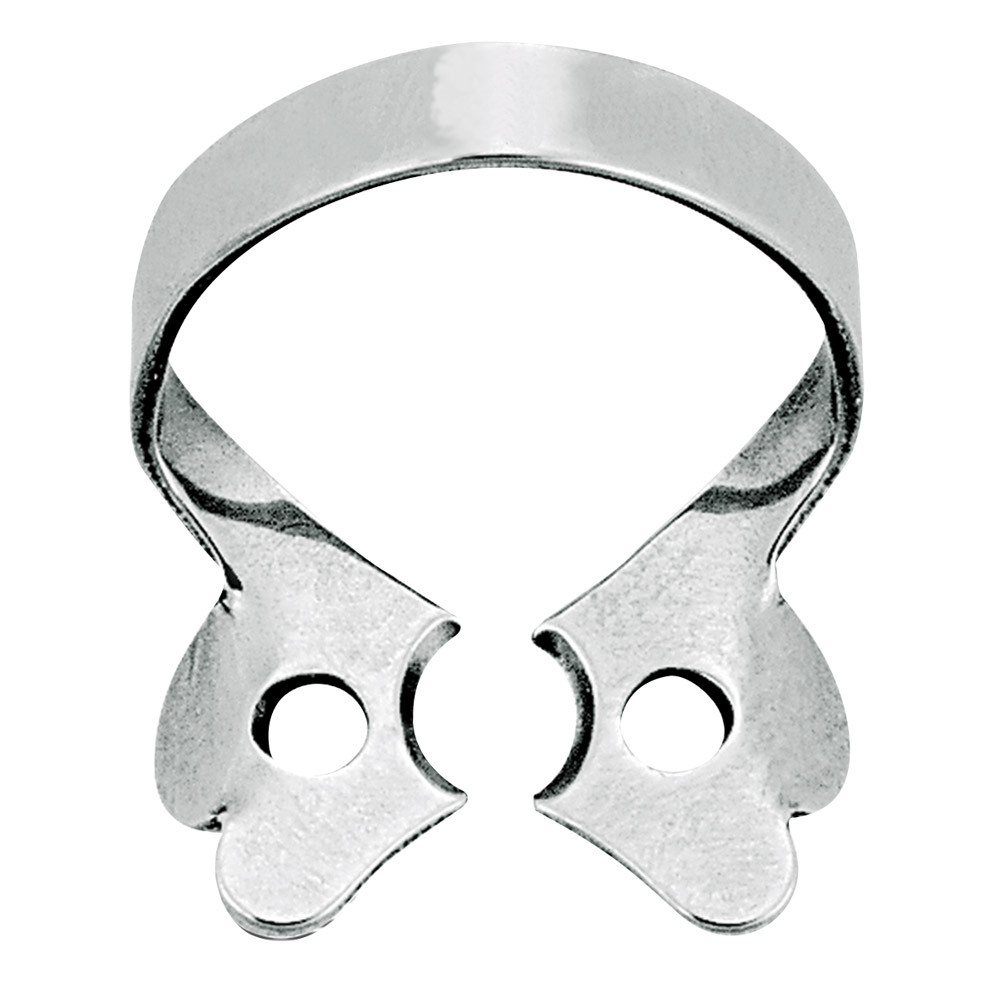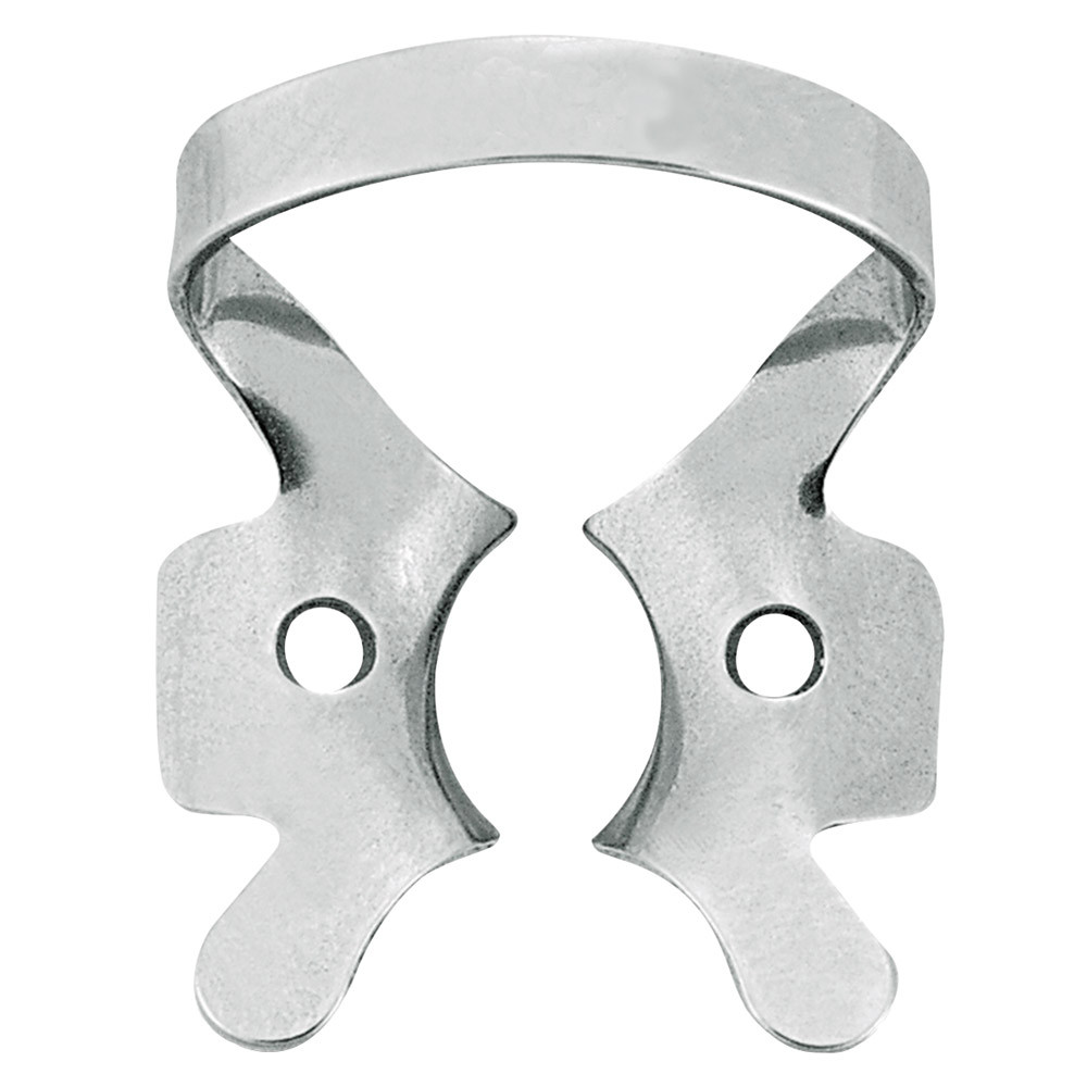 Hoogwaardige roestvrijstalen klemmen met betrouwbare constante spanning voor het bevestigen van de rubberdam op het te behandelen gebitselement.